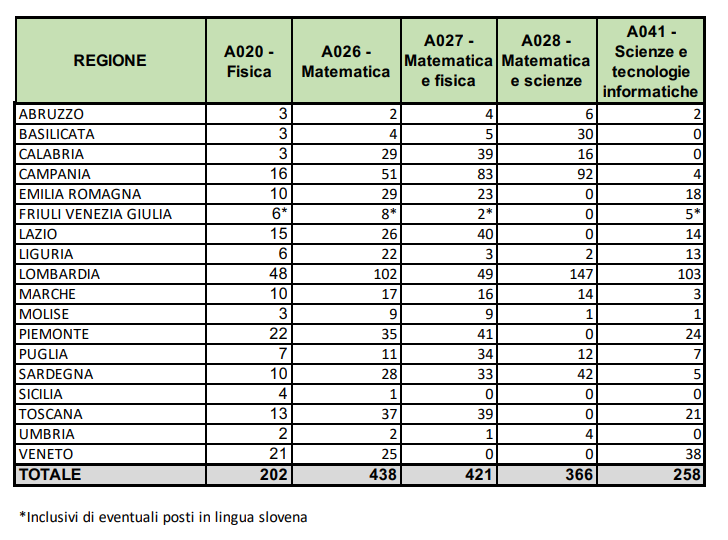 Sono 1.685 i posti disponibili, divisi secondo le classi di concorso Fisica, Matematica, Matematica e Fisica, Matematica e Scienze, Scienze e Tecnologie informatiche. Discipline che sono in coerenza con le misure di rafforzamento per l’apprendimento contenute anche nel Piano Nazionale di Ripresa e Resilienza.