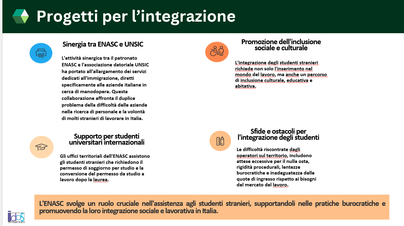 L’Enasc, patronato dell’organizzazione datoriale Unsic, da anni opera nel campo dell’immigrazione, attraverso i suoi sportelli dedicati sul territorio che seguono le pratiche di rilascio e rinnovo dei permessi di soggiorno, i ricongiungimenti familiari, le prenotazioni al test di lingua italiana. Ha partecipato al dibattito portando la sua esperienza diretta e il lavoro svolto nel tempo. Proprio facendo riferimento alla Sicilia, nello specifico a Ragusa, insieme a Unsic, ha sviluppato un modello pionieristico che collega direttamente le aziende italiane a corto di personale con lavoratori immigrati formati nei loro Paesi d’origine. Una visione che tutela imprese e lavoratori, sottraendo manodopera alla criminalità. Il progetto pre-partenza realizzato in Tunisia ha attivato una formazione mirata indirizzata a 700 persone con corsi di lingua italiana, educazione civica e formazione professionale specifica, basata sulle reali necessità delle aziende italiane. Grazie a questa iniziativa, oltre 400 cittadini tunisini sono entrati legalmente in Italia per lavorare nelle aziende del ragusano. È stato presentato anche un secondo progetto che si rivolge ai familiari di cittadini che entrano con ricongiungimento, fornendo loro una formazione linguistica e civica essenziale per una vera inclusione sociale e per prevenire fenomeni di isolamento e violenza domestica. Anche nel Nord Italia l’attività sinergica tra il patronato Enasc e l’associazione datoriale Unsic ha portato all’allargamento dei servizi dedicati all’immigrazione, diretti specificamente alle aziende. Questa collaborazione affronta un duplice problema che trova riscontro anche nei dati presentati dall’Idos, ossia la difficoltà delle aziende italiane nella ricerca di lavoro e la contemporanea volontà di molti stranieri di venire a lavorare nel nostro Paese.