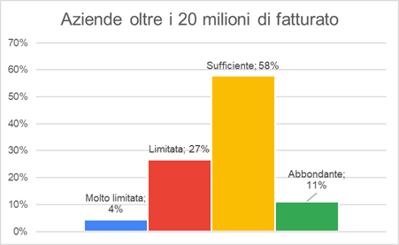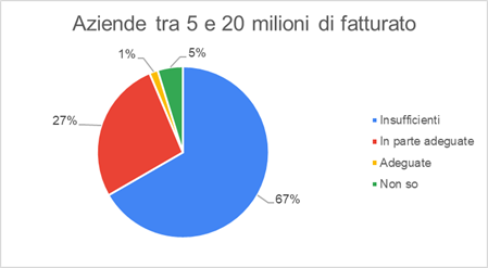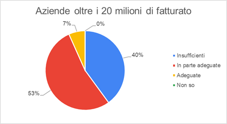 La fiducia però crescein maniera direttamente proporzionale alla dimensione dell’azienda: infatti, se tra le PMI con fatturato inferiore ai 20 milioni, è circa il 67-70% ad esprimere scetticismo (considerando le misure come “non sufficienti”), spostando l’attenzione verso le imprese il cui fatturato si colloca oltre i 20 milioni, la percezione viene ribaltata: solo il 40% le definisce non sufficienti, il 53% ritiene che le misure siano “in parte adeguate”.