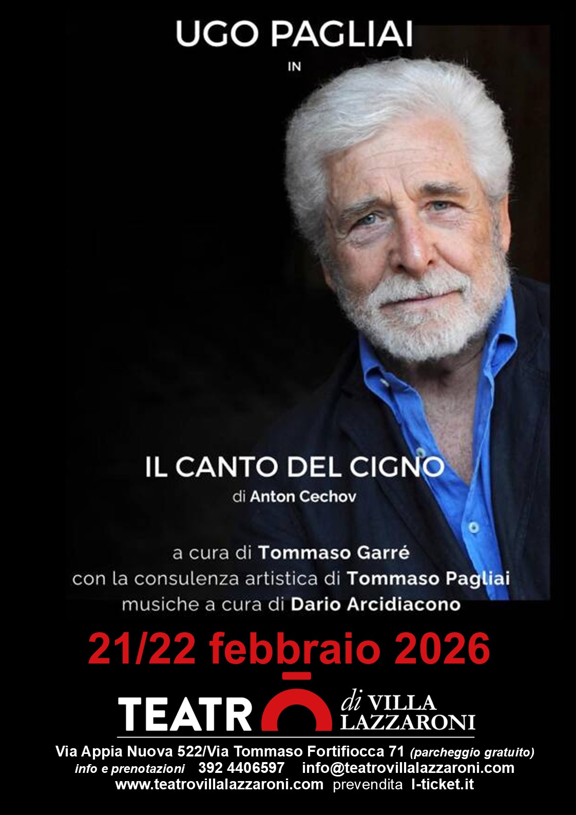 Sabato 21 e domenica 22 febbraio il Teatro di Villa Lazzaroni presenta Il Canto del cigno di Anton Cechov, con Ugo Pagliai, spettacolo a cura di Tommaso Garré, con la consulenza artistica di Tommaso Pagliai e le musiche a cura di Dario Arcidiacono.