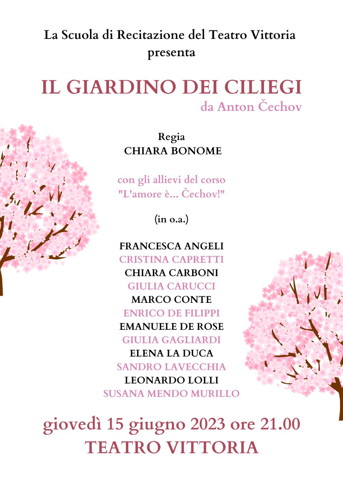 La commedia di Cechov sarà messa in scena giovedì 15 giugno 2023, alle ore 21, al teatro “Vittoria” in piazza di Santa Maria Liberatrice 10 a Testaccio, dalla compagnia della Scuola di recitazione del teatro “Vittoria”. La regia è di Chiara Bonome.